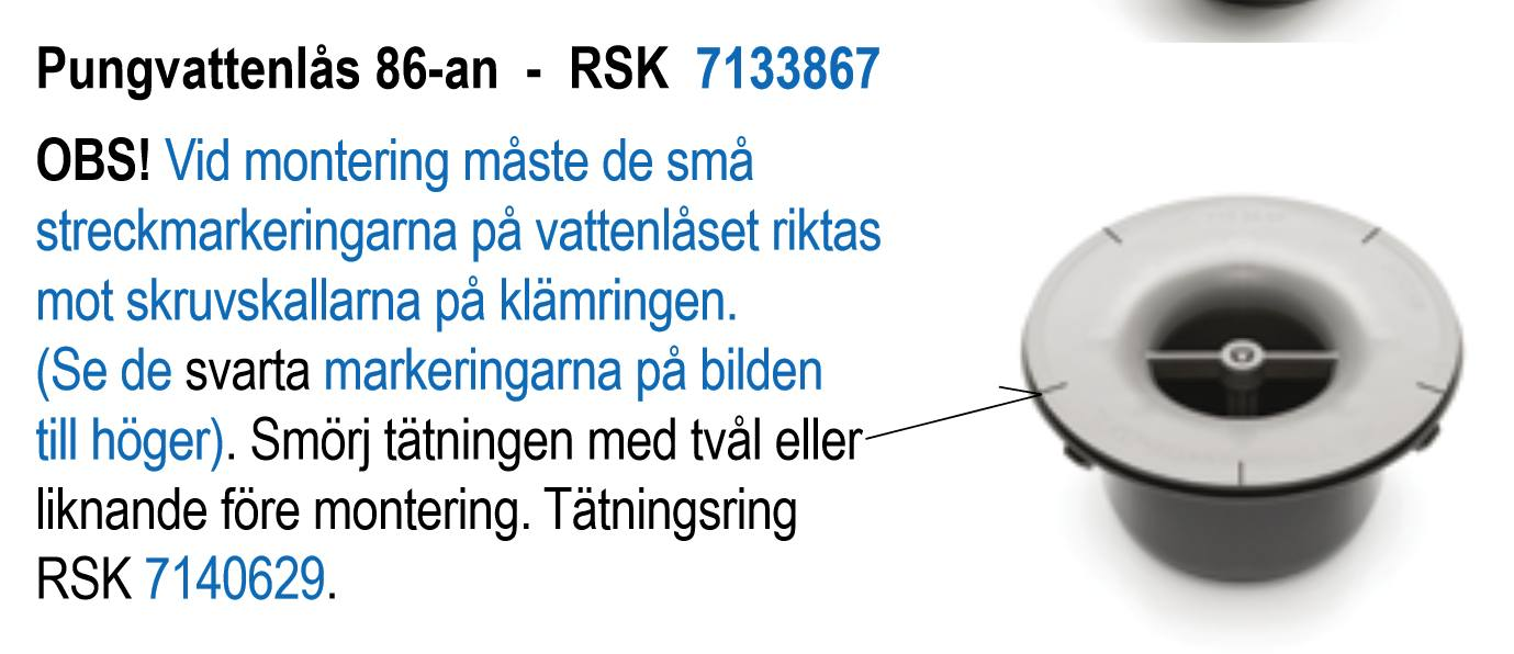1. Det är viktigt att streckmarkeringarna ligger i linje med där skruvarna finns i golvet där vattenlåset ska sitta. På bilden ser man ”streck” som går mot centrumhålet, dessa ska alltså riktas mot skruvhuvuden som finns på golvbrunnen