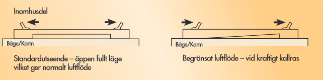 Det är oerhört viktigt att ventilerna aldrig stängs helt, om man gör det förstör man luftflödet och problem med ventilationen uppstår på flera olika sätt. Om man trots det, vid kallras vintertid, känner behov av att minska på mängden inomhusluft som tillförs via ventilen kan man tillfälligt halvera flödet i varje ventil genom att skjuta reglaget endast på ena sidan (se illustration). Vid eventuella luftföroreningslarm ska reglagen på båda sidor skjutas in mot ventilen så att den stängs helt, och sedan öppnas då larmet hävs.