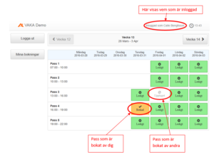 När du är inloggad får du en översikt över innevarande vecka och du kan även byta vecka genom att peka på ”nästa” vecka, i detta fall Vecka 14. Det är möjligt att boka 1 antal samtidiga pass och max 4 veckor framåt i tiden